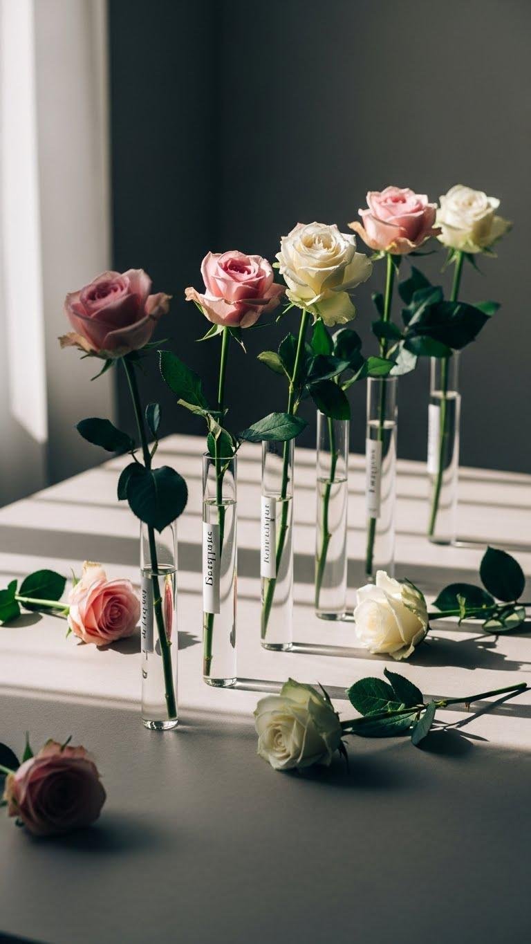 A single stem rose slipped into a slim glass tube makes a quietly striking centerpiece you can arrange with effortless precision. You’ll line glass tubes down a table or scatter them solo, letting single stems speak.