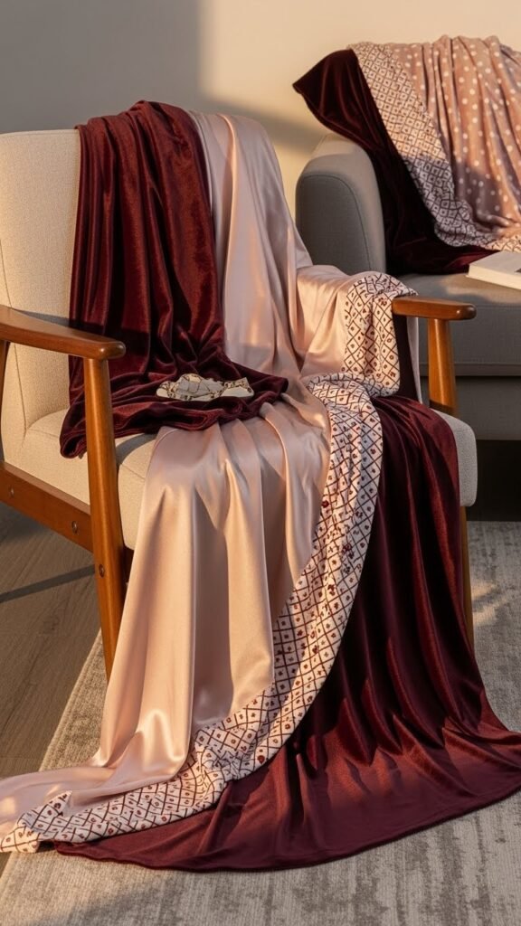 You’ll choose a velvet satin blend for luxe sheen, pairing muted blush with deep wine for contrast.