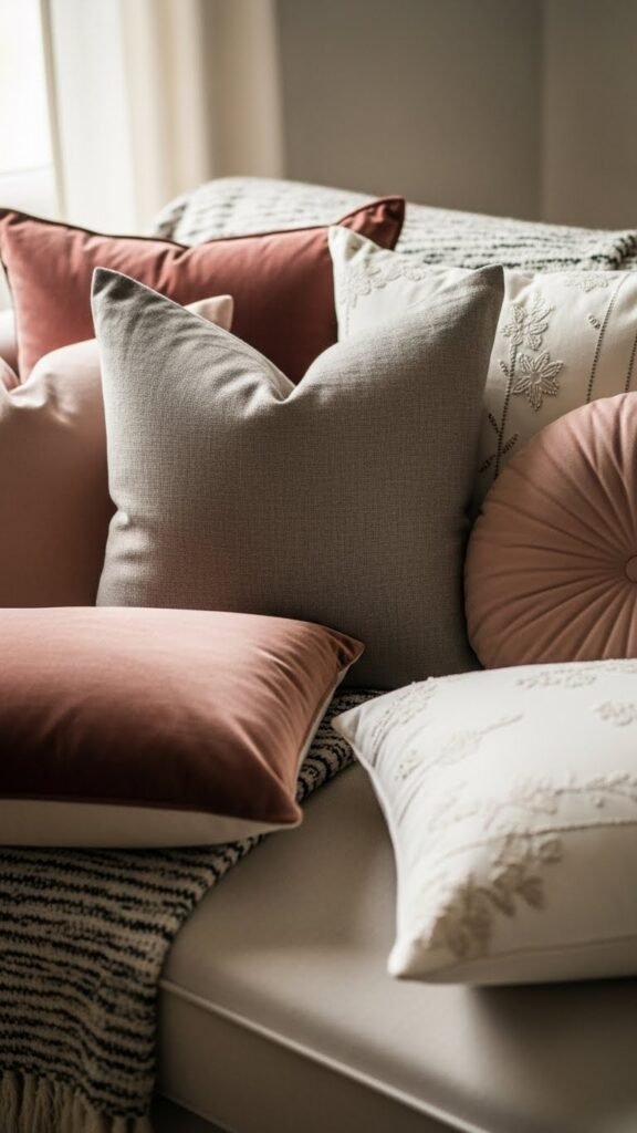 You’ll mix silk embroidery accents with plush velvet and monochrome textures, stagger sizes for movement, and let each piece breathe so your sofa feels liberated, intimate, and intentionally curated.
