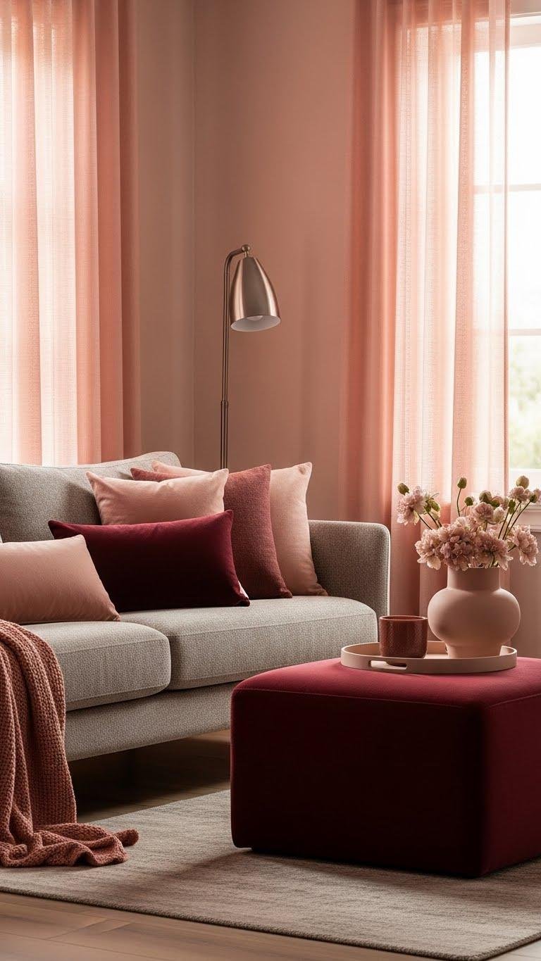Anchor the room with a blush and burgundy accent palette that feels both modern and quietly romantic—think soft rose tones paired with deep, wine-rich hues to create depth and warmth.