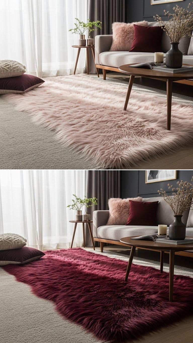 Often a faux-fur runner or plush area rug instantly elevates a living room with tactile luxury, so choose one that reads as chic rather than kitschy; opt for a low-sheen long-pile in a soft blush or warm ivory to complement your blush-and-burgundy palette, or pick a deep wine tone to ground the seating area and tie into darker accents.