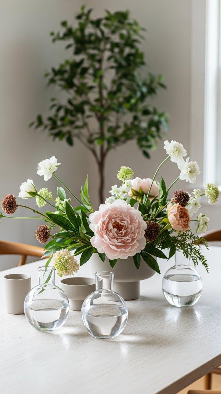After the small tree quietly draws the eye upward, bring that same sculptural energy down to table level with thoughtfully arranged blooms—fresh or faux—that feel curated, not piled on. You’ll mix a silk peony focal with seasonal stems, tuck single stems into minimal budvases, and let negative space breathe.