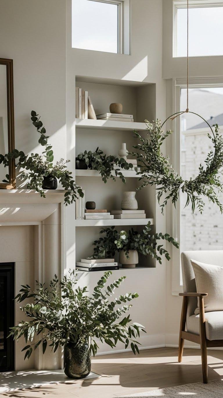 You’ll lean on dried eucalyptus stems for texture, tuck sprigs into bookshelves, and anchor mantels with asymmetric clumps.