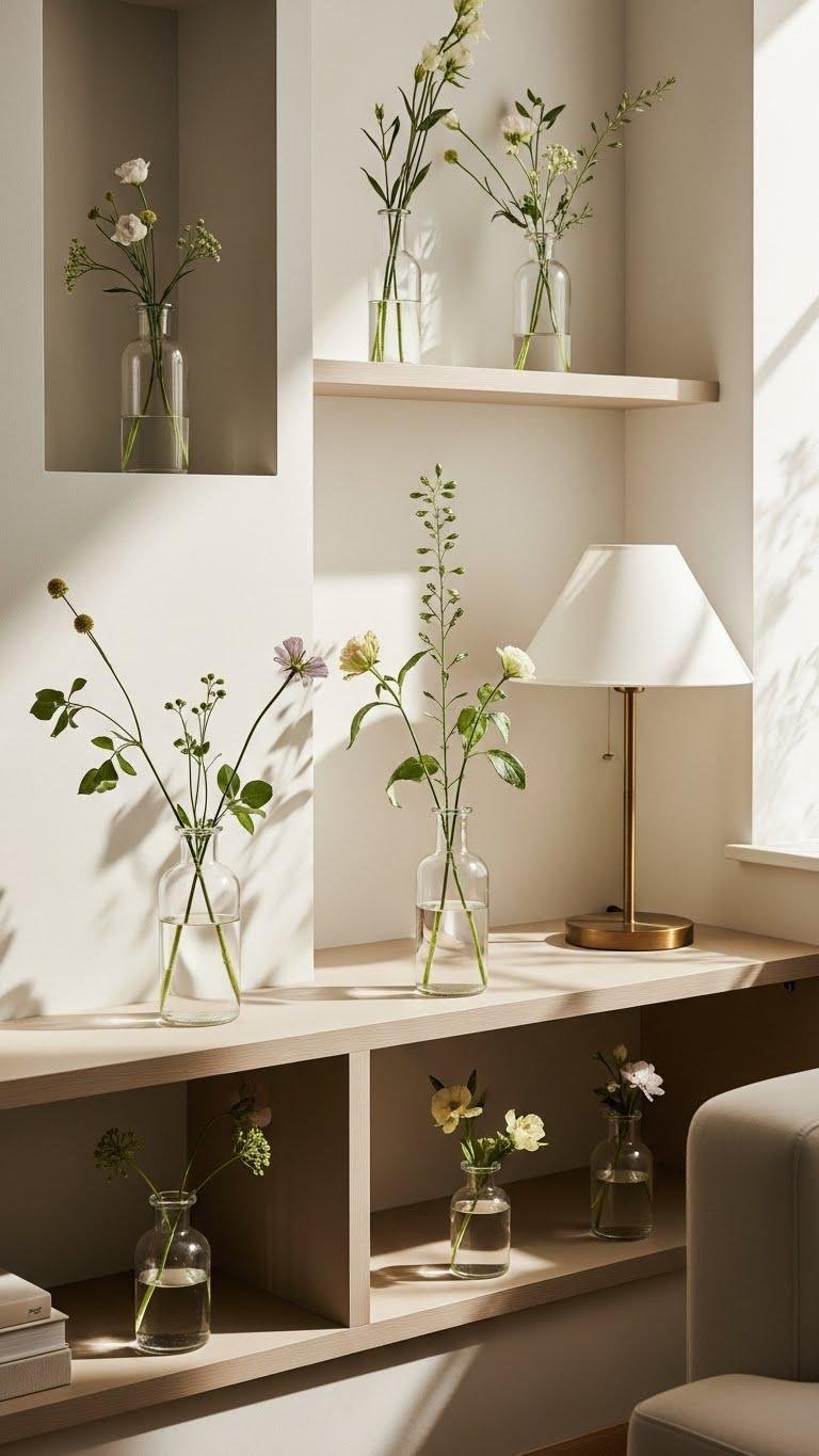Carry the same pared-back, botanical mood into single-stem bud vases placed throughout the room. You’ll place minimalist stems in clustered nooks, on shelves, and beside lamps to punctuate sightlines. Pick scented vases sparingly so fragrance feels intentional, not overwhelming.