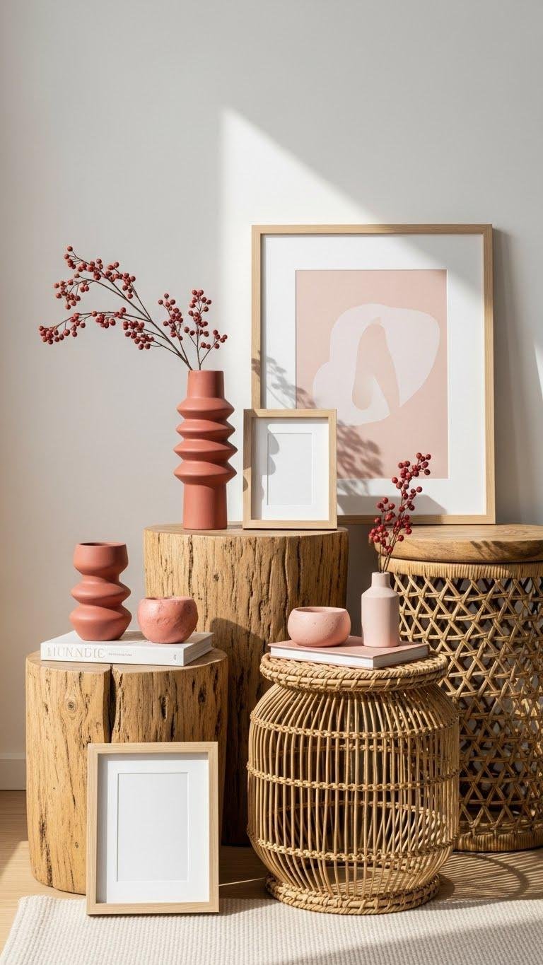 Bringing natural wood and woven pieces into your living room instantly grounds the Valentine palette with tactile warmth and quiet craftsmanship. You’ll mix reclaimed timber accents—side tables, picture frames—with sculptural woven baskets to add rhythm and storage.