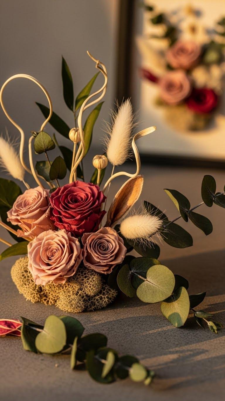 Preserved botanicals let you keep the soft, lived-in texture of fresh flowers without the upkeep, so you can layer dried roses, preserved eucalyptus, and bleached bunny tails into your Valentine scheme and expect them to hold their shape and color for months.