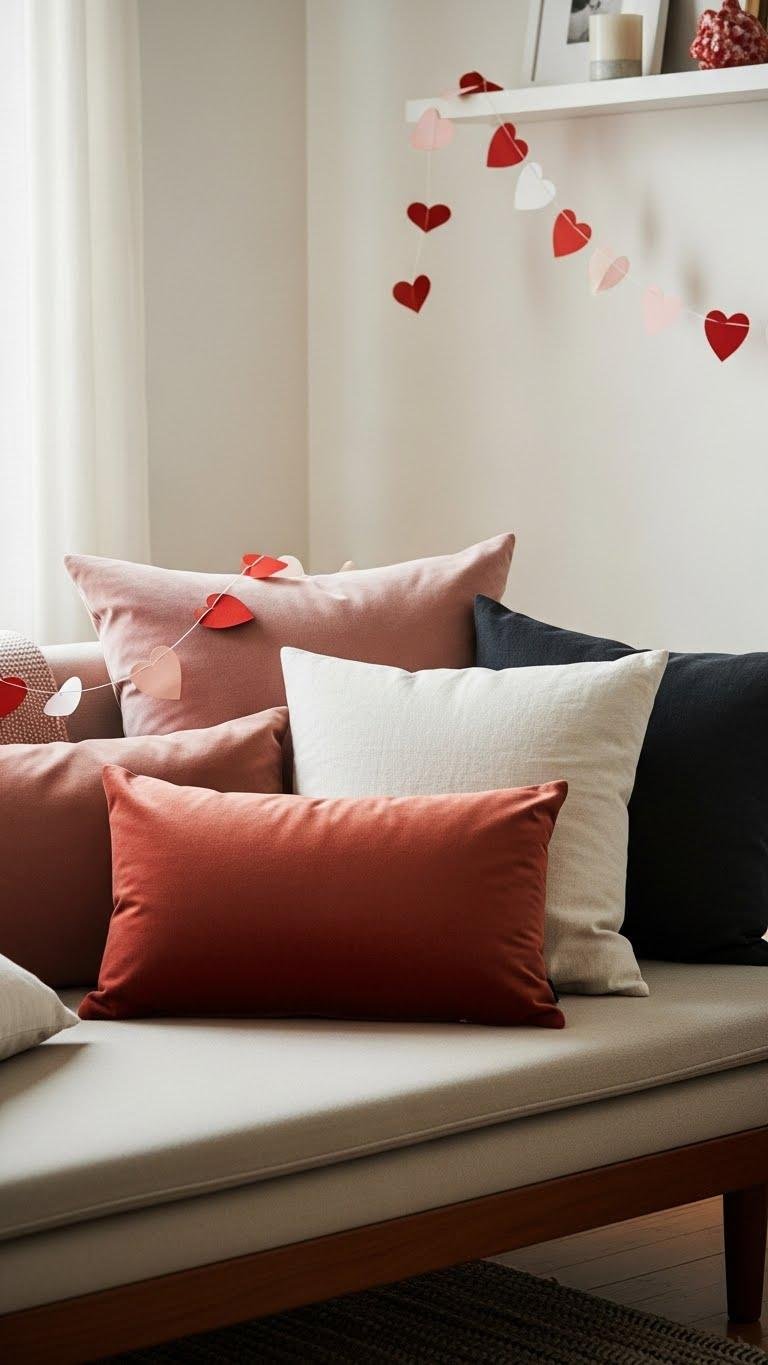 Often, you’ll find that swapping a few well-chosen pillows and draping a delicate heart garland instantly updates the room for Valentine’s without feeling overtly seasonal.