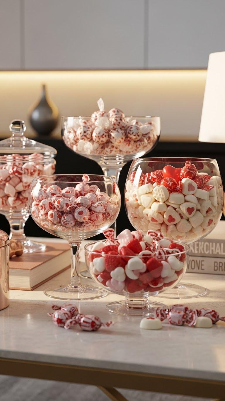 Anchor your coffee table or console with decorative bowls overflowing with chocolates and candy — they’re an instant, chic way to blend Valentine charm with everyday style.