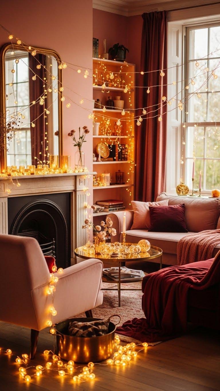 Drape warm-toned string and fairy lights to wash your living room in a soft, honeyed glow that instantly softens the blush-and-burgundy palette and adds a romantic, editorial edge.