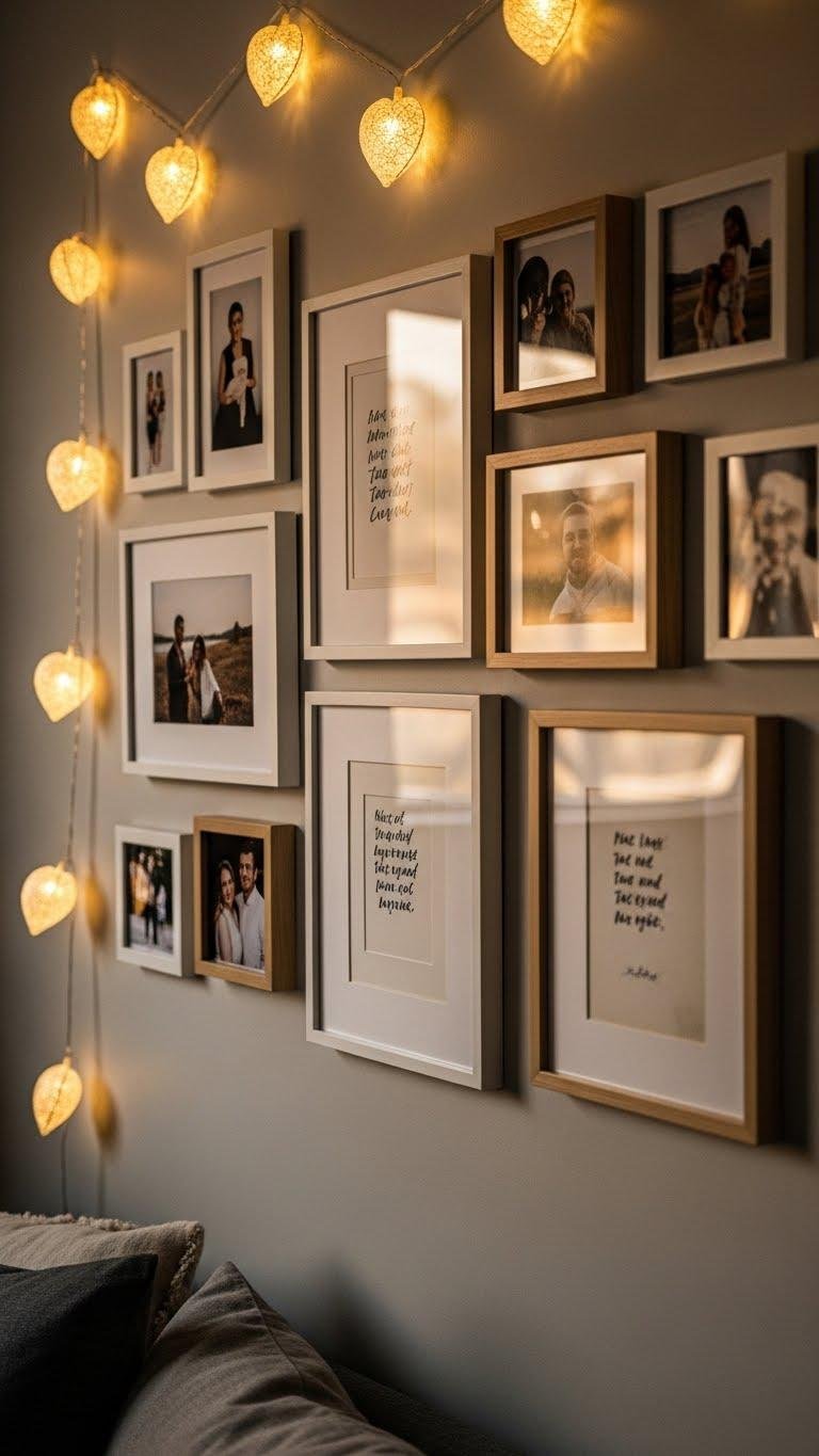 After the soft glow of heart-shaped lights sets the mood, bring personal stories forward with a memory and photo gallery wall that feels curated, not cluttered.