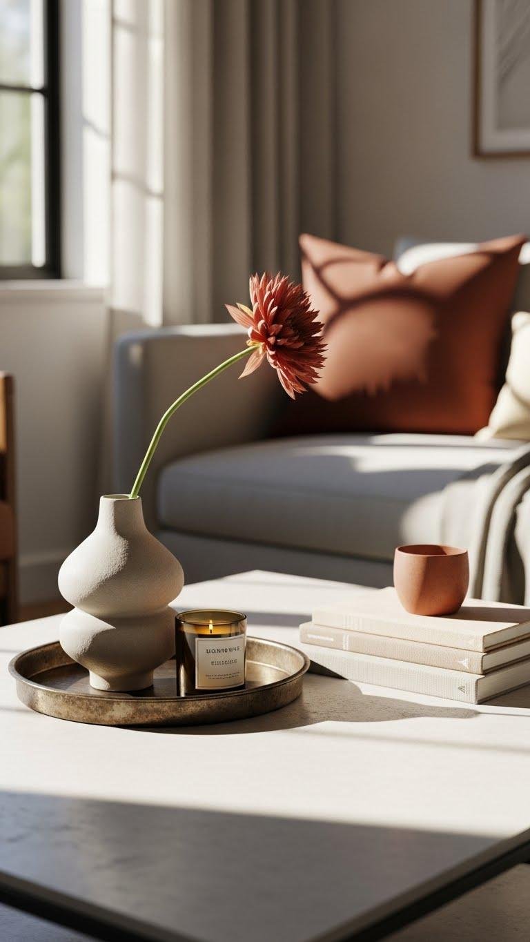 Anchor your seating area with a statement coffee-table centerpiece that feels curated, not crowded — think a low, sculptural vase or tray as the focal point, paired with one bold floral stem or an artful stack of tactile books. Choose an antique tray to ground a sculptural centerpiece and a candle or artisan object; you’ll keep it minimal, modern, and liberating.