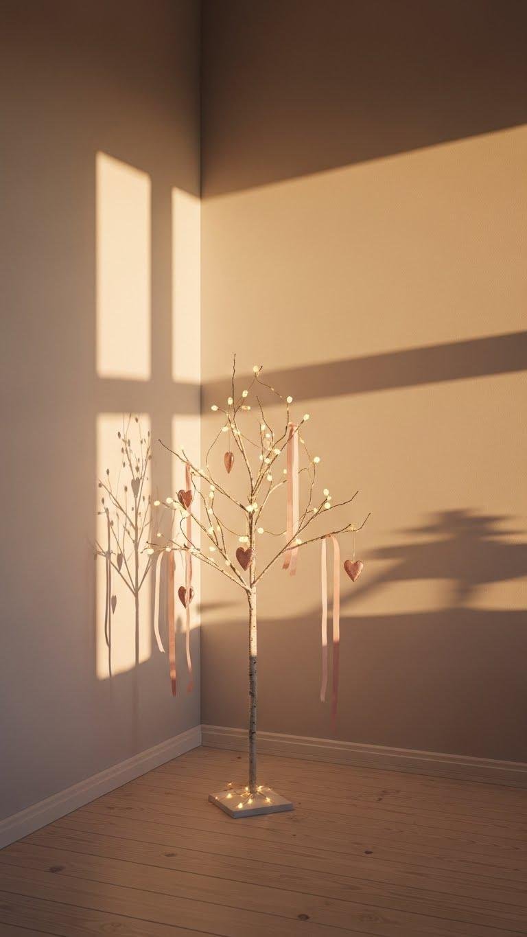 For a soft, unexpected focal point, place a small romantic tree or a sculptural branch in a corner to give the room vertical interest and a whisper of romance. You’ll style it with delicate lights, hanging hearts, or tiny ribbons — think miniature arbors and subtle twig chandeliers — letting the piece feel airy, modern, and free rather than fussy or overdecorated.