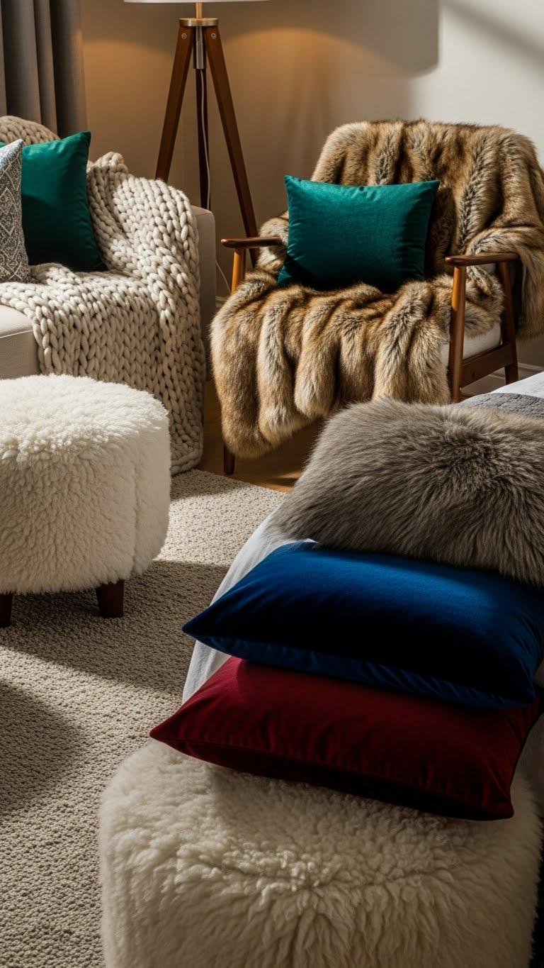 After you’ve layered a chunky knit throw, soften the room further by adding faux fur accents to chairs and beds—they bring instant warmth and a luxe, tactile contrast.