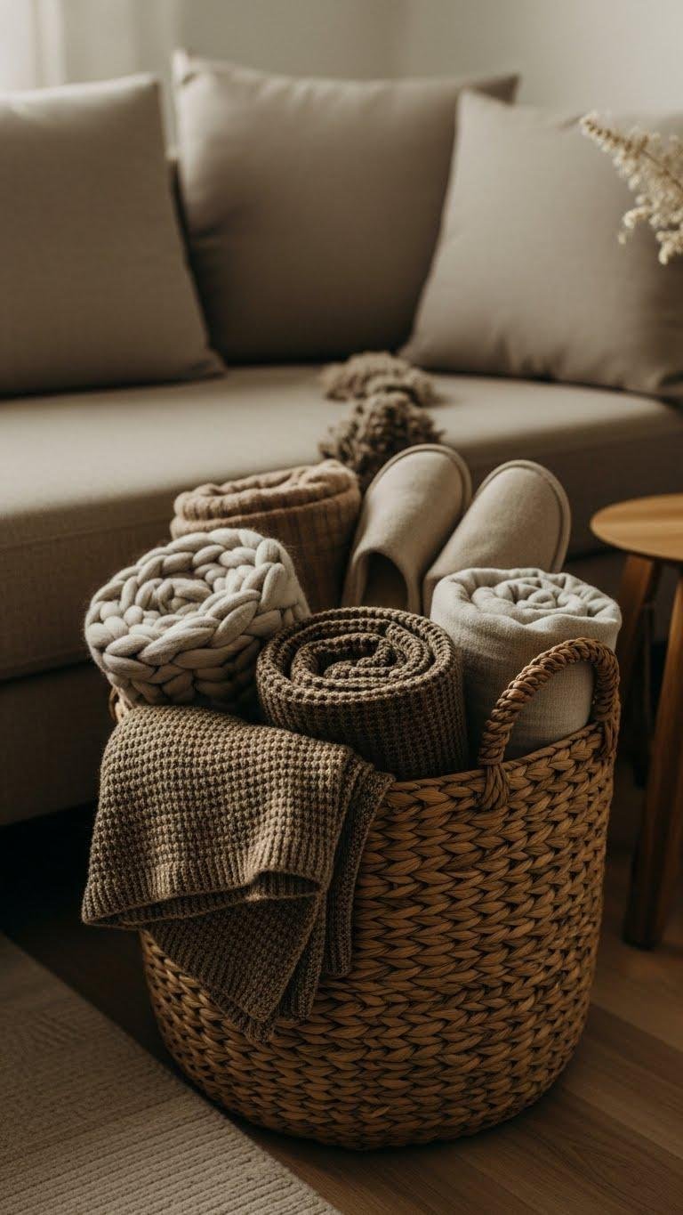 Often you’ll want to keep a woven basket by the sofa or entryway so a stack of soft blankets and a pair of slippers are always within arm’s reach.