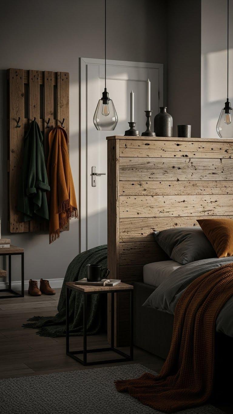 You’ll anchor a bed with a reclaimed wood headboard, add a pallet coat rack for entryway function, and mix rough textures with plush throws and matte metals to create a liberating, curated cozy.