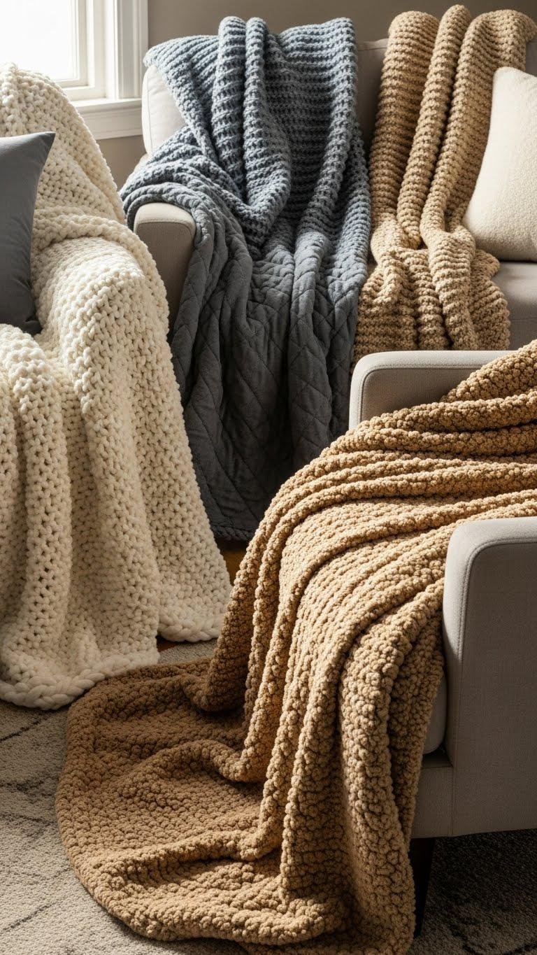 Drape a couple of heavy‑weight throws over your sofa and armchairs to instantly signal warmth and invite use; choose throws in varying textures—think chunky knit, quilted wool, or faux shearling—to add depth without clutter.