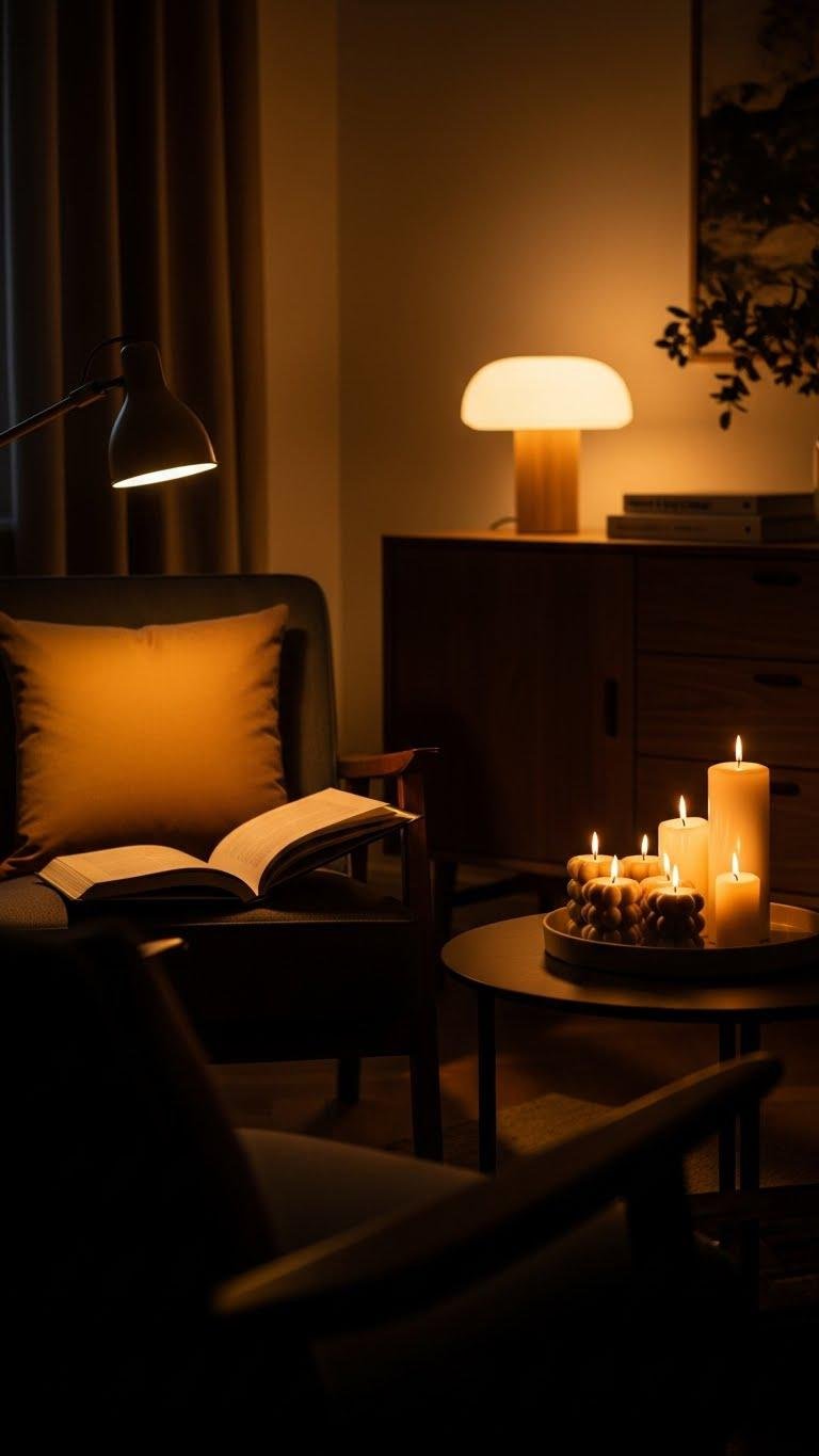You’ll mix soft glow lamps with sculptural fixtures, arrange candle cluster vignettes at varying heights, and trust dim, deliberate light to set a liberated, cozy mood.