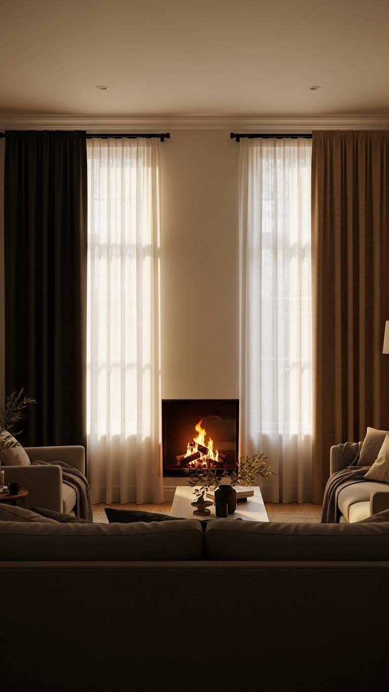 Once your seating orients around the hearth, keep the warmth where it counts by layering thermal curtains with sheer panels—this combo traps heat and softens light without closing off the room.