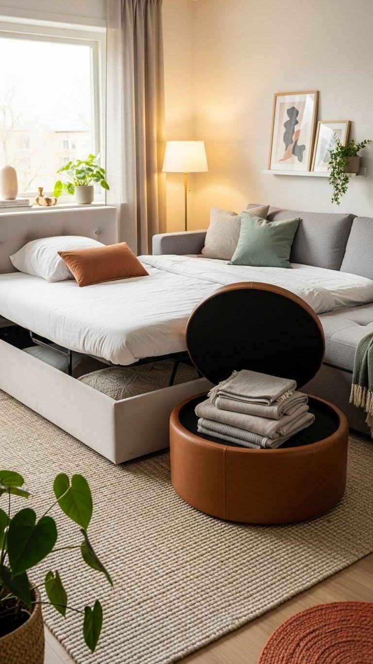 When space is at a premium, choose furniture that does double duty—think a plush daybed with hidden storage, a ottoman that opens to stow blankets, or a sleeper sofa that feels as inviting as a regular couch.