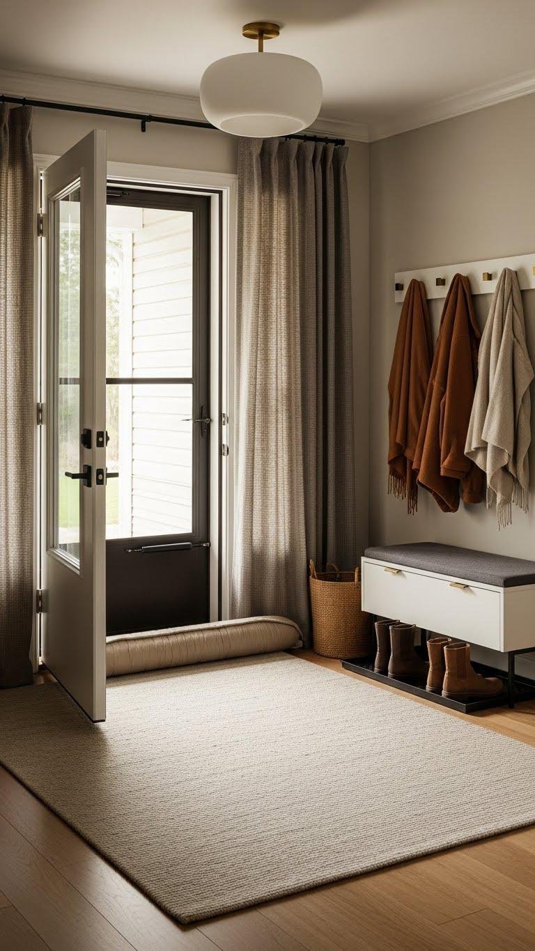 Give your entryway a purposeful makeover so it keeps cold air out and looks pulled together. Add insulated draft dodgers at door bases, heavy curtains for storm doors, and a solid rug to trap warmth.