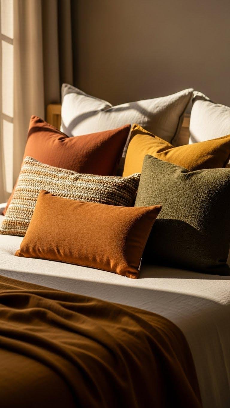 Choose accent pillows in warm palettes to anchor the bed and introduce mood through color and texture. You’ll mix earthy tones—burnt sienna, ochre, deep olive—with varied scales and tactile inserts for depth.