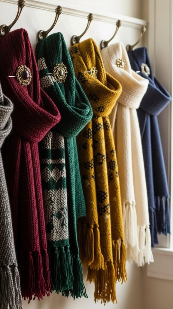 [IMAGE PROMPT: A cozy, styled interior vignette showing a row of decorative wall hooks at eye level, each draped with a curated assortment of winter scarves — chunky textured knits, bold patterned silks, and tasseled woolens. Soft, warm natural light from a nearby window creates gentle shadows and highlights the scarves’ textures and rich colors (deep burgundy, forest green, mustard, navy, and cream); a few scarves are pinned with vintage brass brooches for a touch of polish. Composition is intimate and inviting, shallow depth of field focusing on the fabrics and tassels, photorealistic lifestyle photography with a clean, slightly rustic aesthetic.]