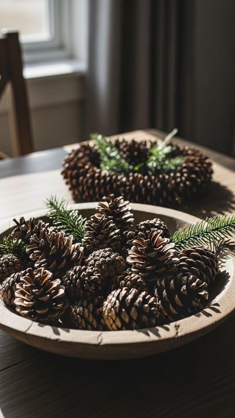 A shallow wooden bowl filled with mixed pinecones makes an effortless centerpiece that feels both rustic and refined. You’ll arrange varied sizes, tuck in sprigs of evergreen, and drape a pinecone garlands loop nearby for continuity.