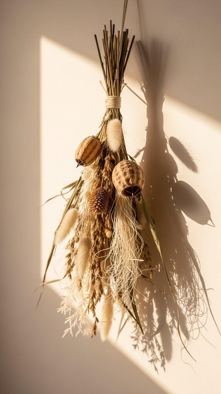 Bring together texture and timelessness with a dried floral wall hanging that instantly elevates your entryway’s winter vibe. You’ll choose dried grass, seed pod accents and wisps of waxed fiber for structure, all bound with neutral threads for a minimalist, free-spirited look. Hang low for intimate impact or alto for drama — it’s a simple, durable statement that lets your space breathe.