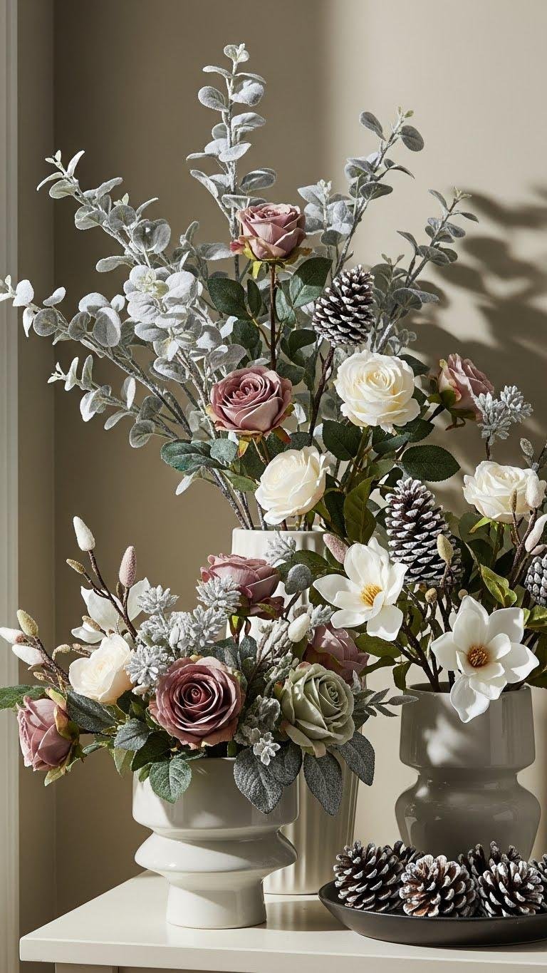 When you cluster faux winter florals, you get instant seasonality without the upkeep—group stems of frosted eucalyptus, velvet roses, and snow-dusted pinecones in varying heights to create depth and movement.