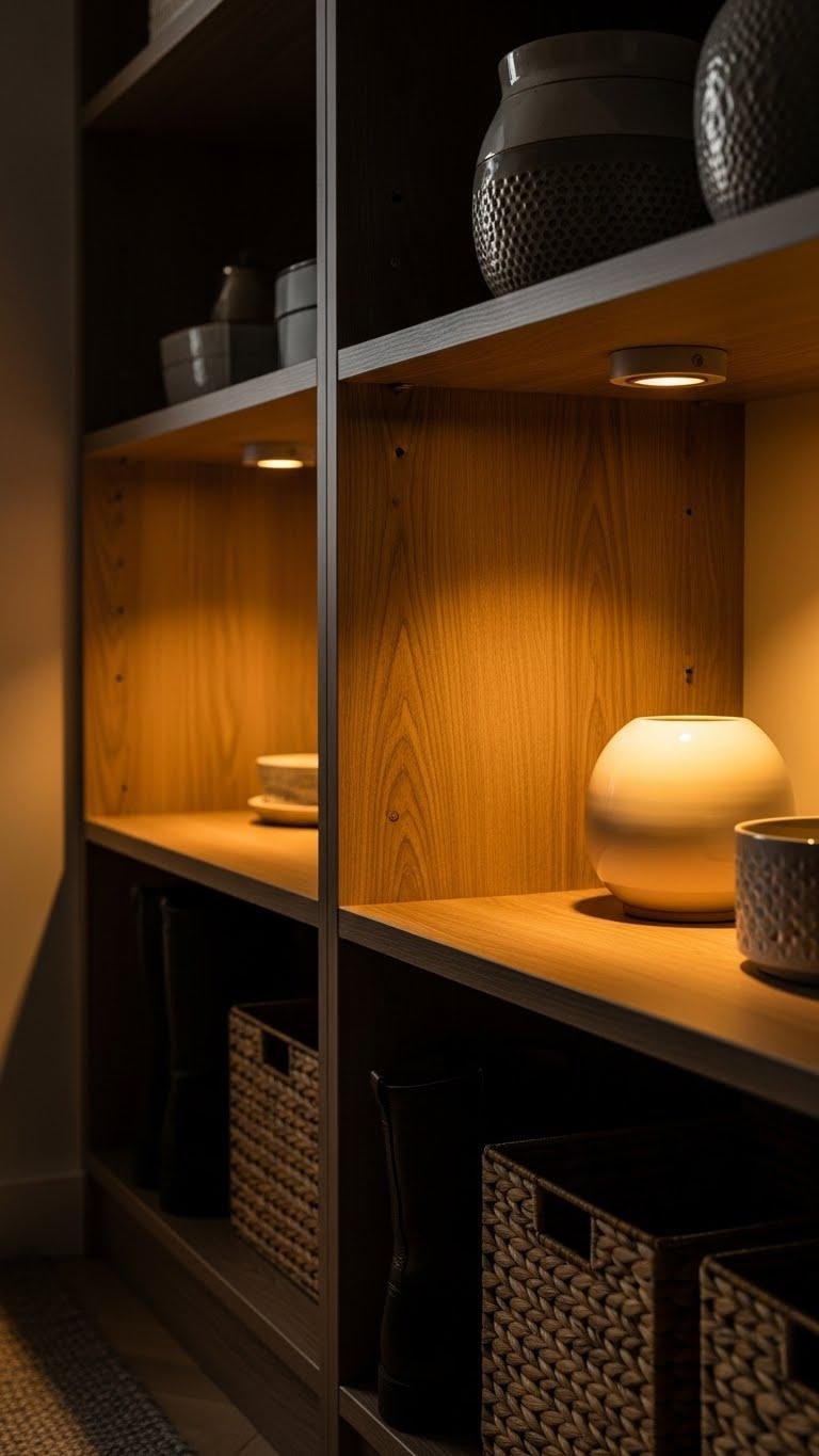 Add warm pools of light beneath shelves to make an entryway feel both practical and inviting. You’ll mount rechargeable pucklights for instant, cordless illumination, or hide discreet under shelf wiring for a sleeker, hardwired look.