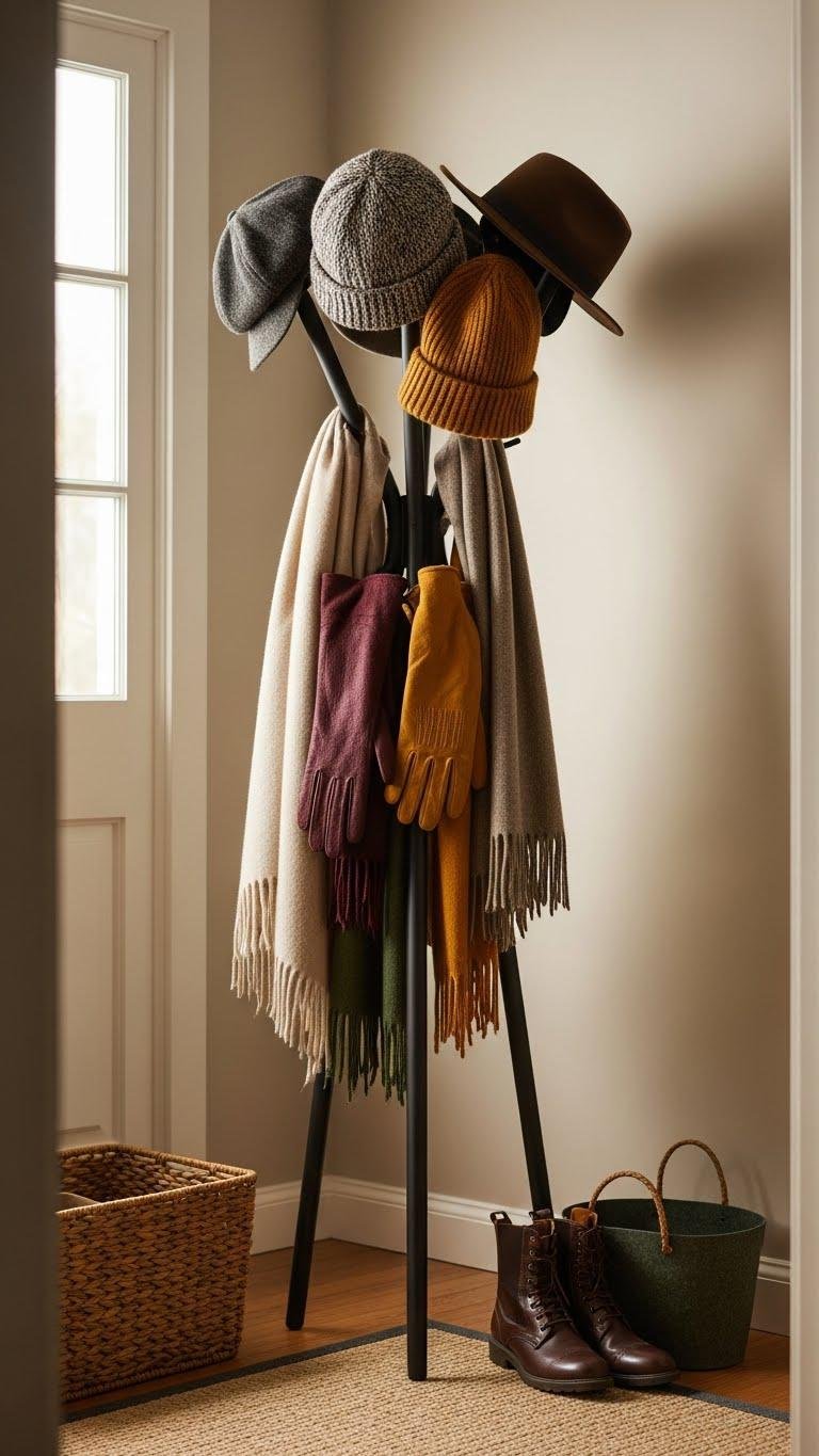 Choose a sculptural rack so you can hang wool caps, scarves, and leather gloves neatly.
