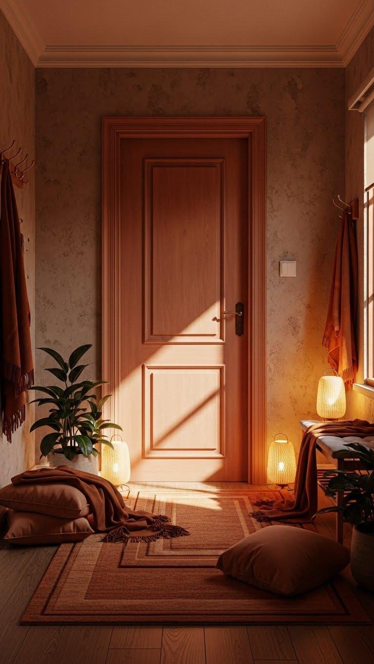 When you layer warm ambers, rosy siennas, and soft golds into your entryway, the space instantly feels sunlit even on gray winter days. Embrace golden hour lamps for low, enveloping light and choose amber textiles—rugs, throws, cushions—that invite touch. You’ll create a liberated, welcoming threshold that balances warmth and clarity, guiding guests in with effortless, confident style.