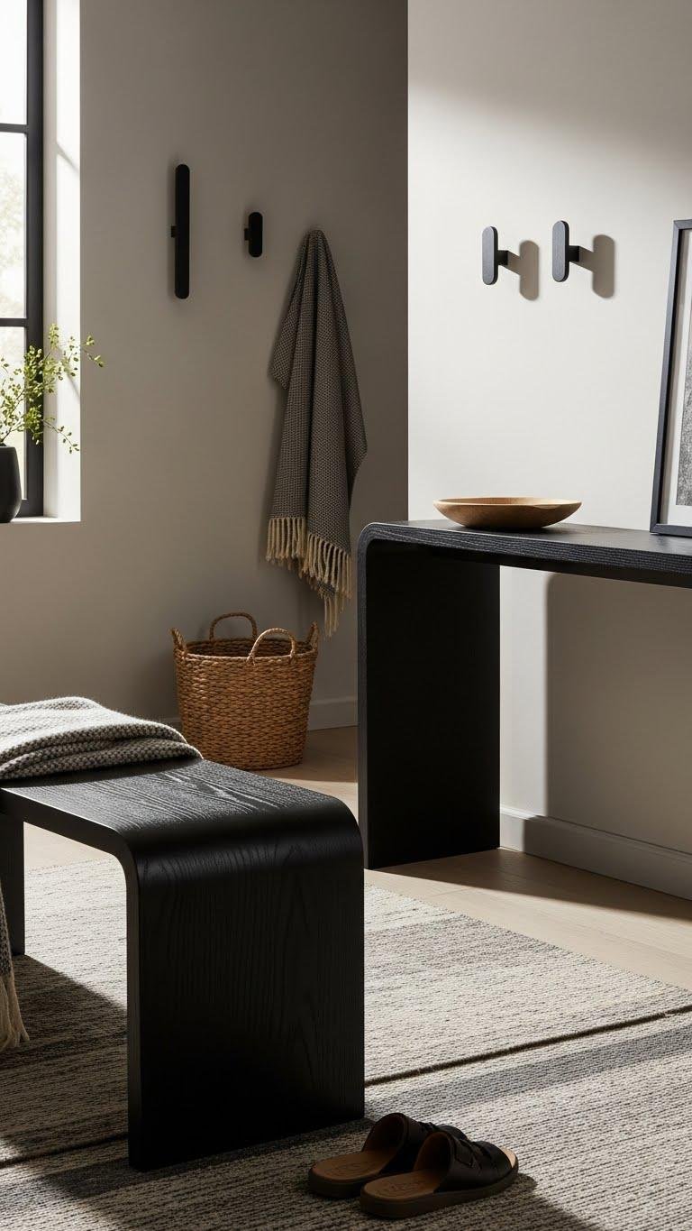 You’ll choose matte ebony pieces—benches, hooks, consoles—with sculpted silhouettes that read clean and intentional. They anchor the space, resist trend fatigue, and let you layer warmth without sacrificing bold, liberated style.