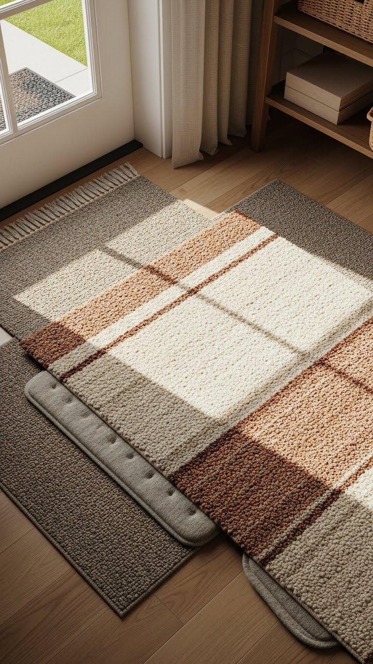 Layer layered runner rugs to instantly warm your entryway both visually and underfoot: start with a durable, narrow base rug for protection and add a softer, textured runner on top to create depth and insulation without crowding the space.