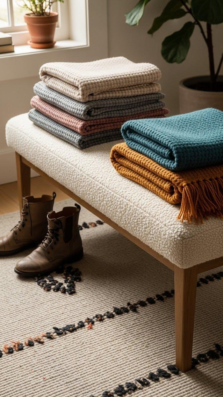 Moving from layered rugs underfoot, bring that same tactile warmth up onto a bench with a cozy boucle and a stack of throw blankets. You’ll choose bouclé seating that feels sculptural yet inviting, then fold textured throws for easy reach. Keep colors muted, add one bold accent, and leave room to sit, shed boots, and breathe—practical, effortless comfort that says you’re free to roam.
