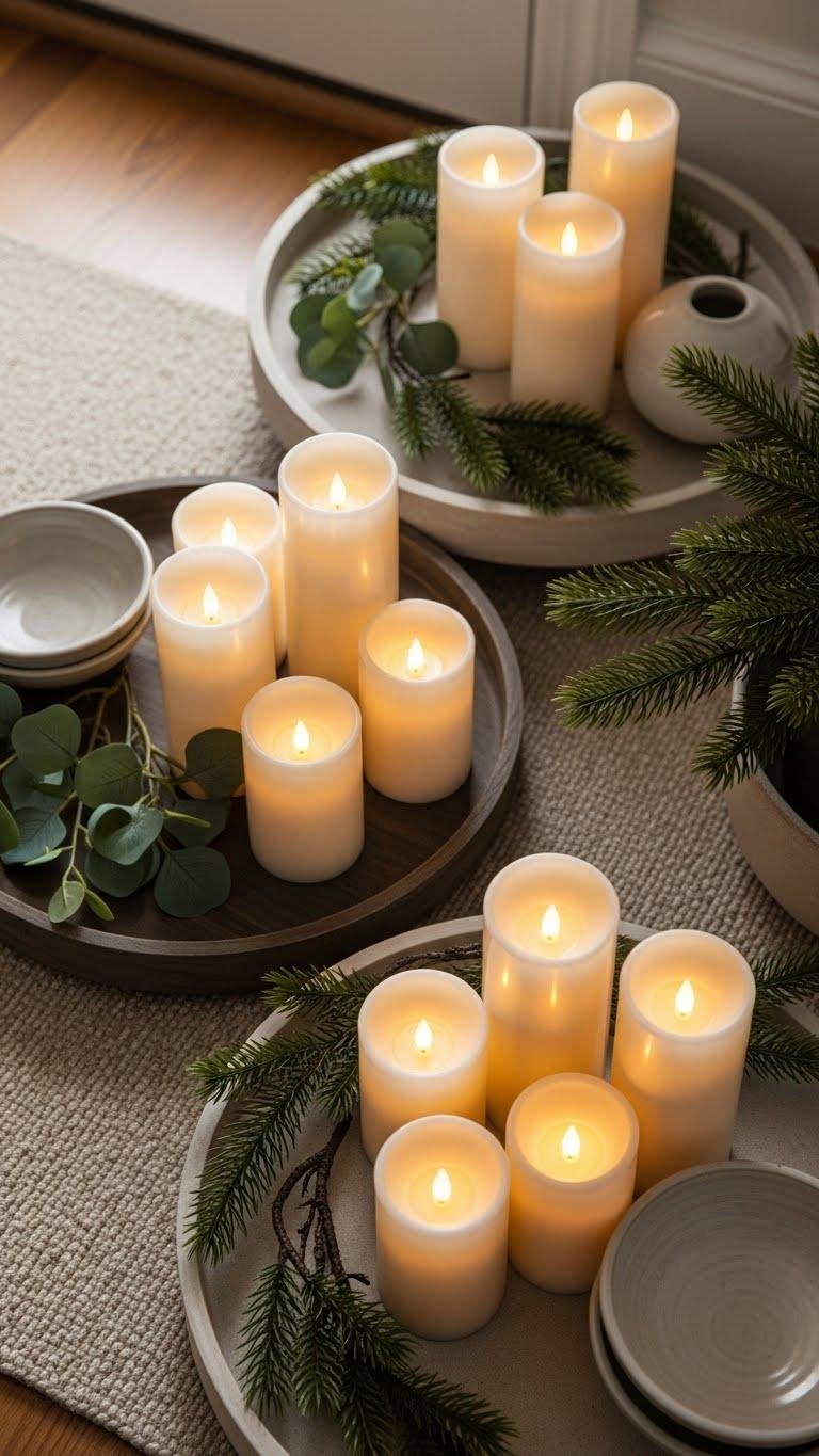 Place faux wax pillars on varied-height trays, cluster with natural greens, and mix scented led mixes for subtle fragrance without fuss.