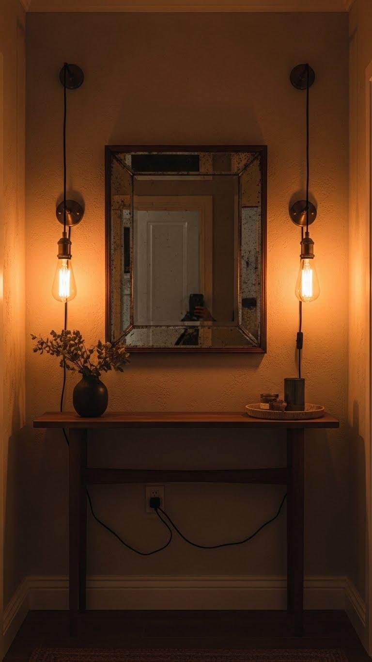 Position an antique beveled mirror above a console, flank it with Edison pendants or sconces, and let layered light highlight texture while giving you a liberated, intentional welcome.