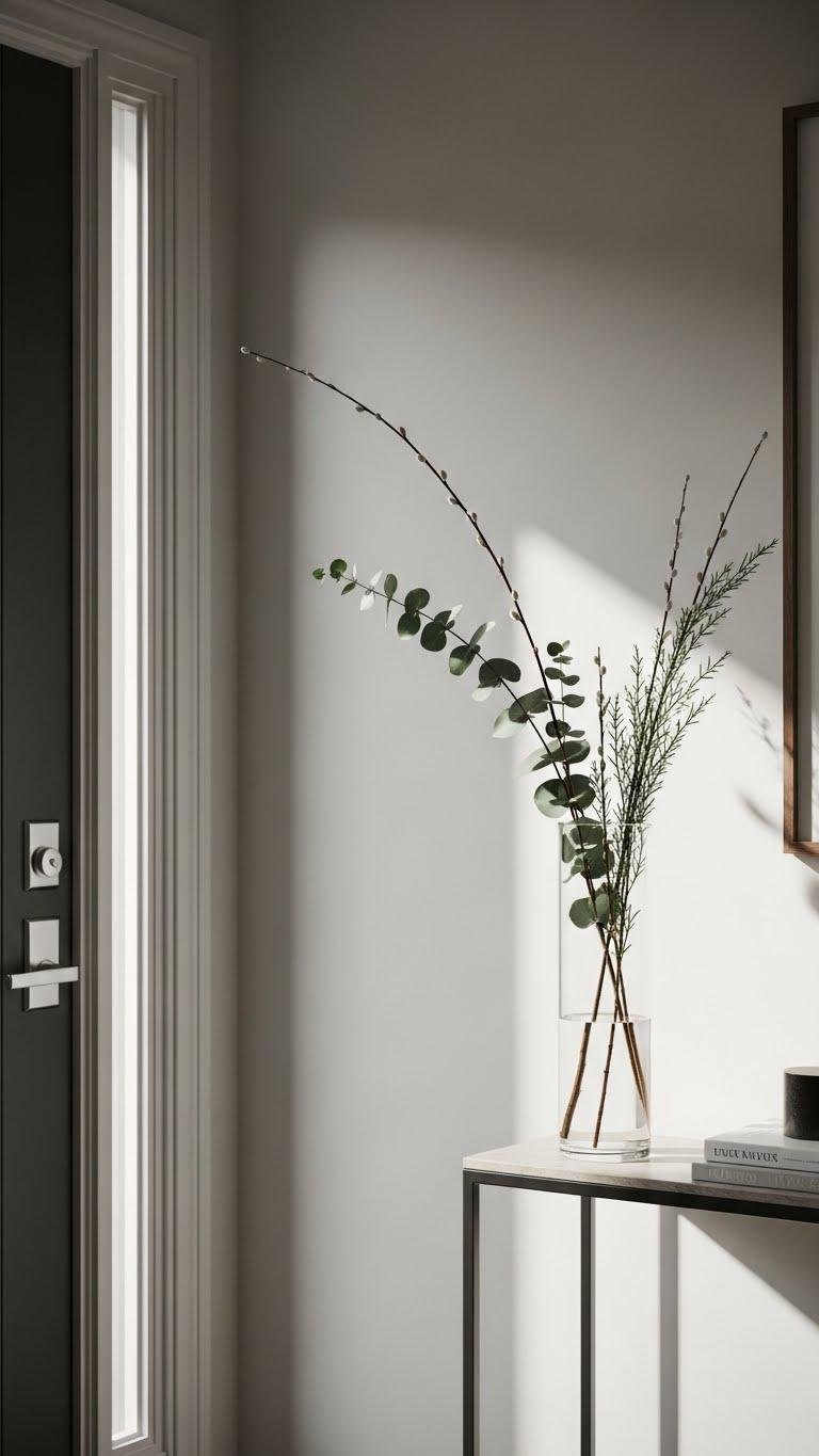 One tall, narrow vase filled with a few long, graceful stems can instantly refine an entryway without crowding it: choose eucalyptus, willow, or slender evergreen branches to add vertical movement, seasonal texture, and a fresh scent.